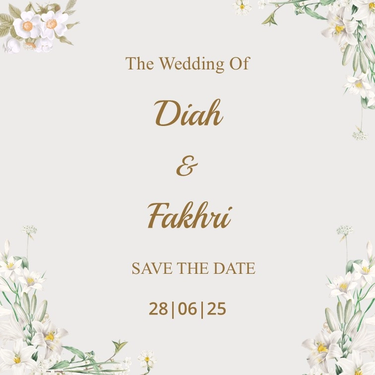 Save The Date Diah & Fakhri kepada Buka Undangan Diah & Fakhri Simpan di Kalender Assalamu’alaikum wr. wb. Segala Puji Bagi Allah SWT yang telah menjadikan hambanya hidup berpasang-pasangan. Dengan memohon Ridho, Rahmat, dan Berkah Allah SWT, kami bermaksud untuk mengundang Saudara/i dalam acara pernikahan yang kami selenggarakan. Count Down Hari Jam Menit Detik MENIKAH […]