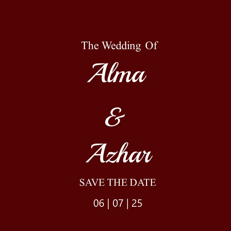 The Wedding Of Alma & Azhar Kepada Yth. Buka Undangan Alma & Azhar 06 . 07 . 2025 A & A “Dan di antara tanda-tanda (kebesaran)-Nya ialah Dia menciptakan pasangan-pasangan untukmu dari jenismu sendiri, agar kamu cenderung dan merasa tenteram kepadanya, dan Dia menjadikan di antaramu rasa kasih dan sayang. Sungguh, pada yang demikian itu […]