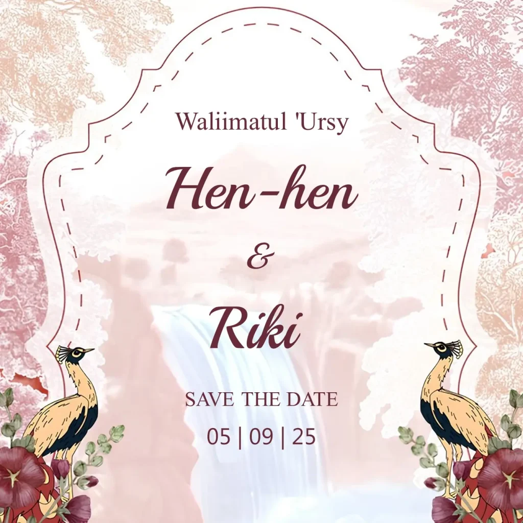 Waliimatul ‘Ursy Hen-hen & Riki Kepada Yth: Buka Undangan Waliimatul ‘Ursy Hen-hen & Riki 05 . 09 . 25 بِسْمِ اللّهِ الرَّحْمَنِ الرَّحِيْمِ وَمِنْ اٰيٰتِهٖٓ اَنْ خَلَقَ لَكُمْ مِّنْ اَنْفُسِكُمْ اَزْوَاجًا لِّتَسْكُنُوْٓا اِلَيْهَا وَجَعَلَ بَيْنَكُمْ مَّوَدَّةً وَّرَحْمَةً ۗ اِنَّ فِيْ ذٰلِكَ لَاٰيٰتٍ لِّقَوْمٍ يَّتَفَكَّرُوْنَ Dan di antara tanda-tanda (kebesaran)-Nya ialah Dia menciptakan pasangan-pasangan untukmu […]