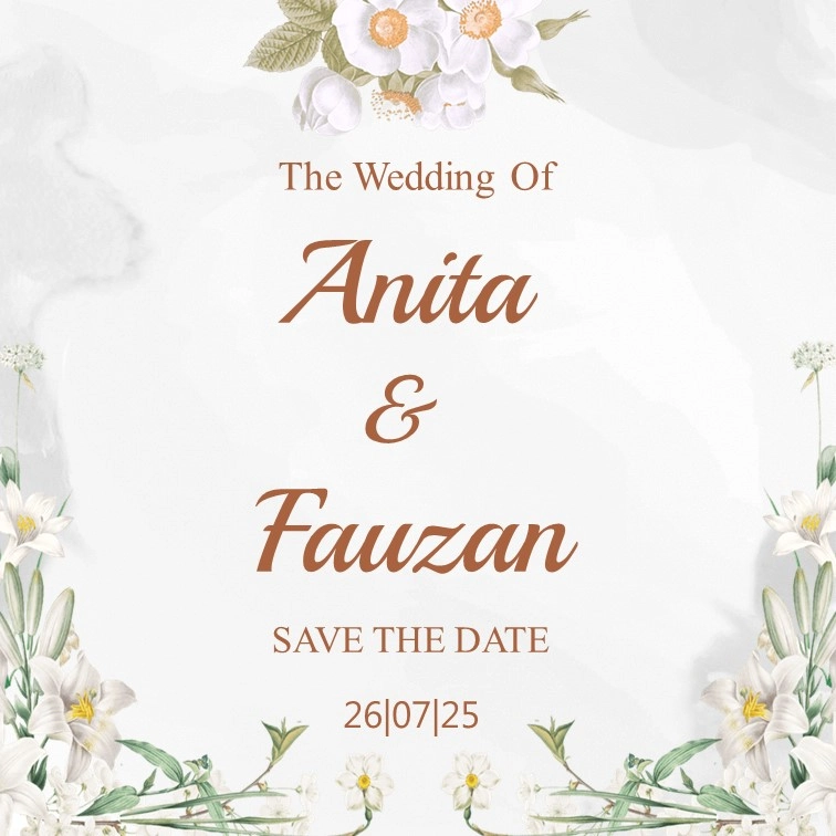 Save The Date Anita & Fauzan kepada Buka Undangan Anita & Fauzan Simpan di Kalender Assalamu’alaikum wr. wb. Segala Puji Bagi Allah SWT yang telah menjadikan hambanya hidup berpasang-pasangan. Dengan memohon Ridho, Rahmat, dan Berkah Allah SWT, kami bermaksud untuk mengundang Saudara/i dalam acara pernikahan yang kami selenggarakan. Count Down Hari Jam Menit Detik MENIKAH […]